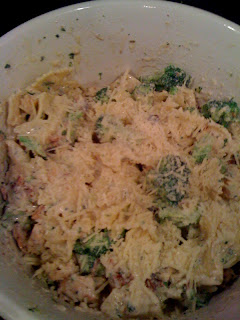 Cook them in the sauce (stirring occasionally) for about 4-5 minutes.  While you're waiting on the broccoli, test your bowtie pasta.  Depending on how you like it cooked (al dente or floppy), strain the pasta when it's done and throw it into the bowl with the chicken and bacon.